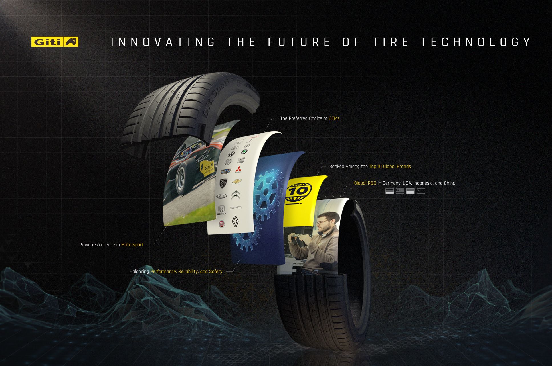 Large-format brand poster for Giti Tire, one of the world's top 10 tire manufacturers, to be displayed across their authorized workshops and tire retailers network in Singapore and Malaysia. The creative concept uses an exploded-view tire as the central visual metaphor, revealing the brand's key pillars layer by layer. The dark, technical aesthetic combines 3D rendering, data visualization elements, and photographic inserts, positioning Giti Tire as a high-technology brand while remaining visually impactful in a point-of-sale environment. The result is a piece of in-store communication that works as a brand statement.